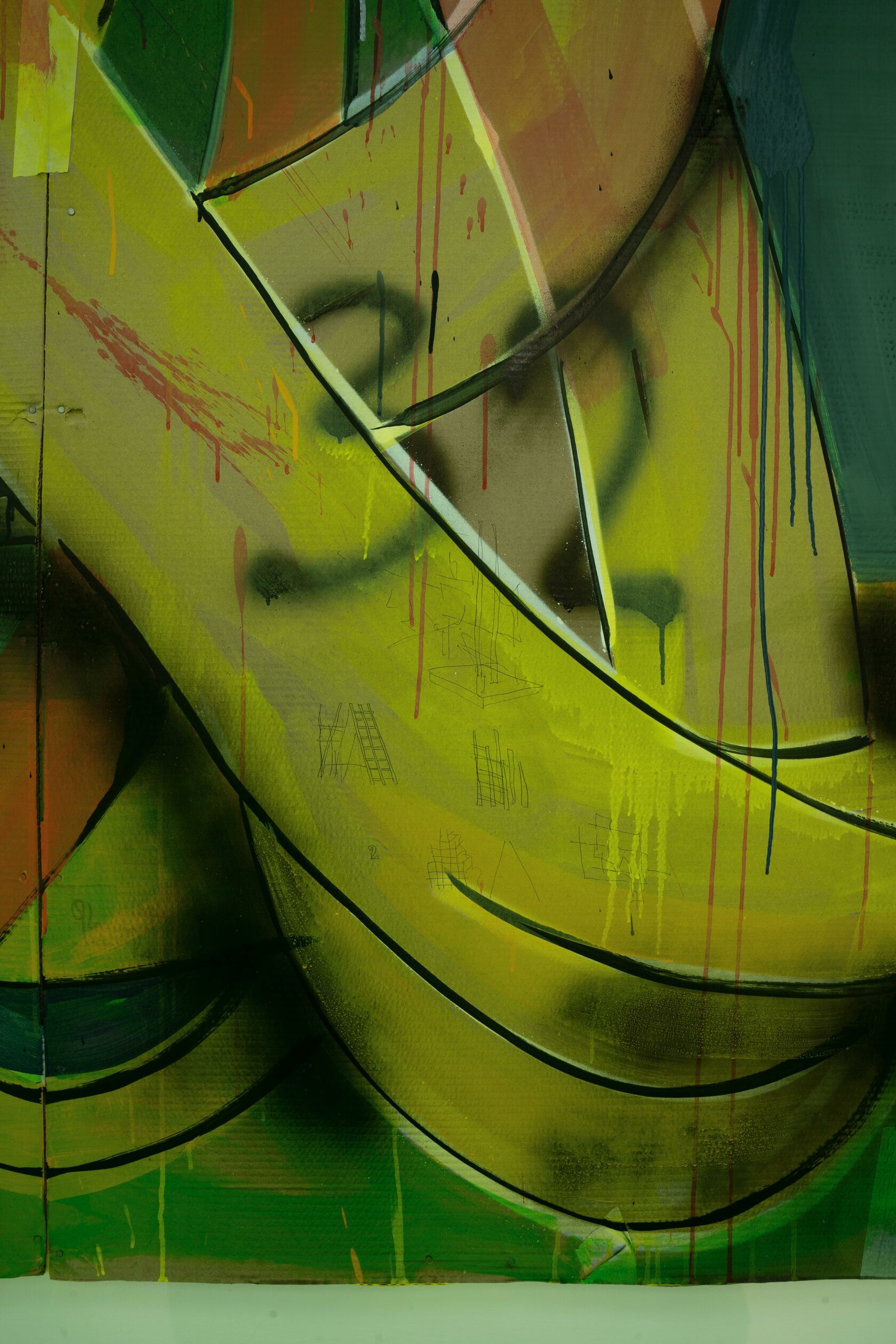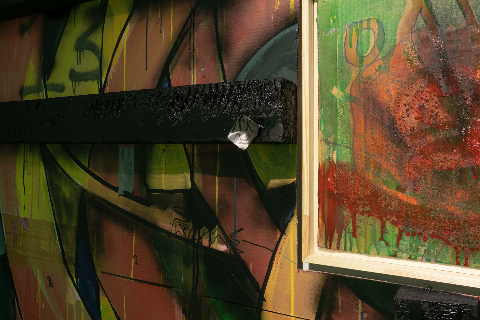 corrugated board, enamel, spray paint, solvent, marker, various types of tape, 149 x 41 cm
