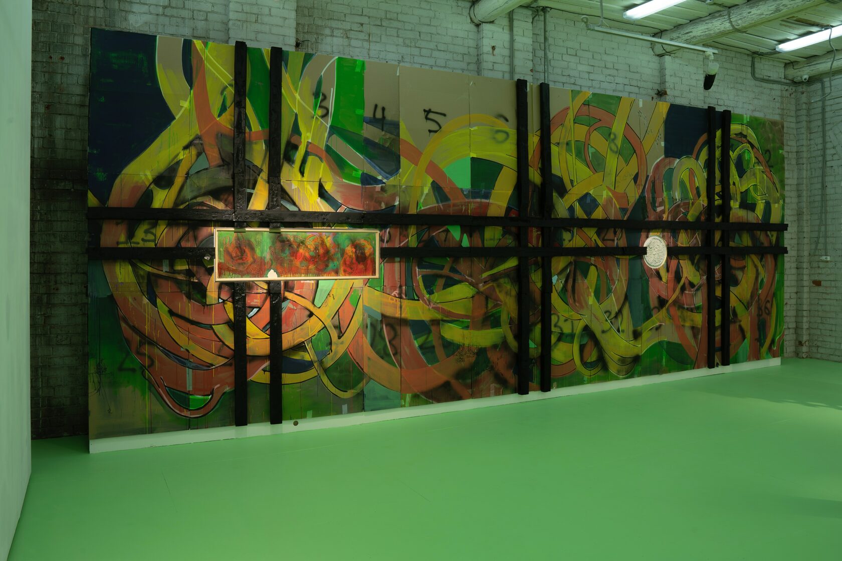 2023, cardboard, extruded polystyrene foam, nitro enamel, acrylic, various types of tape, pen, paint marker, nails, sewing pins, 350 x 880 x 40 cm