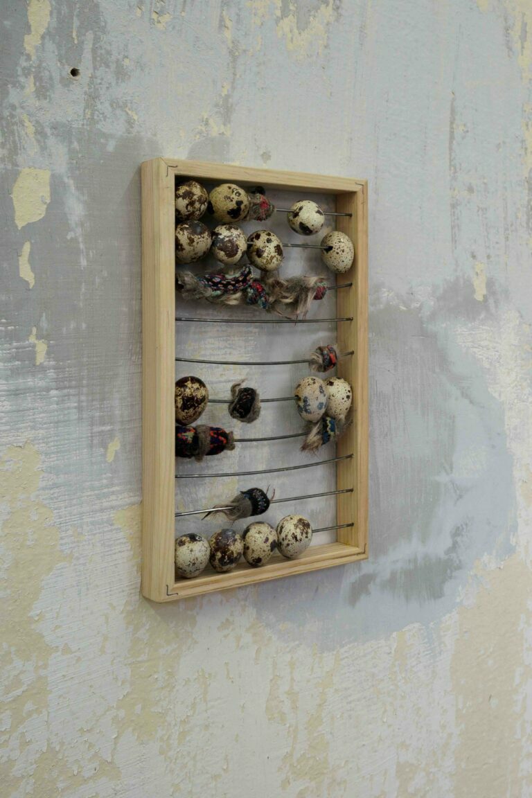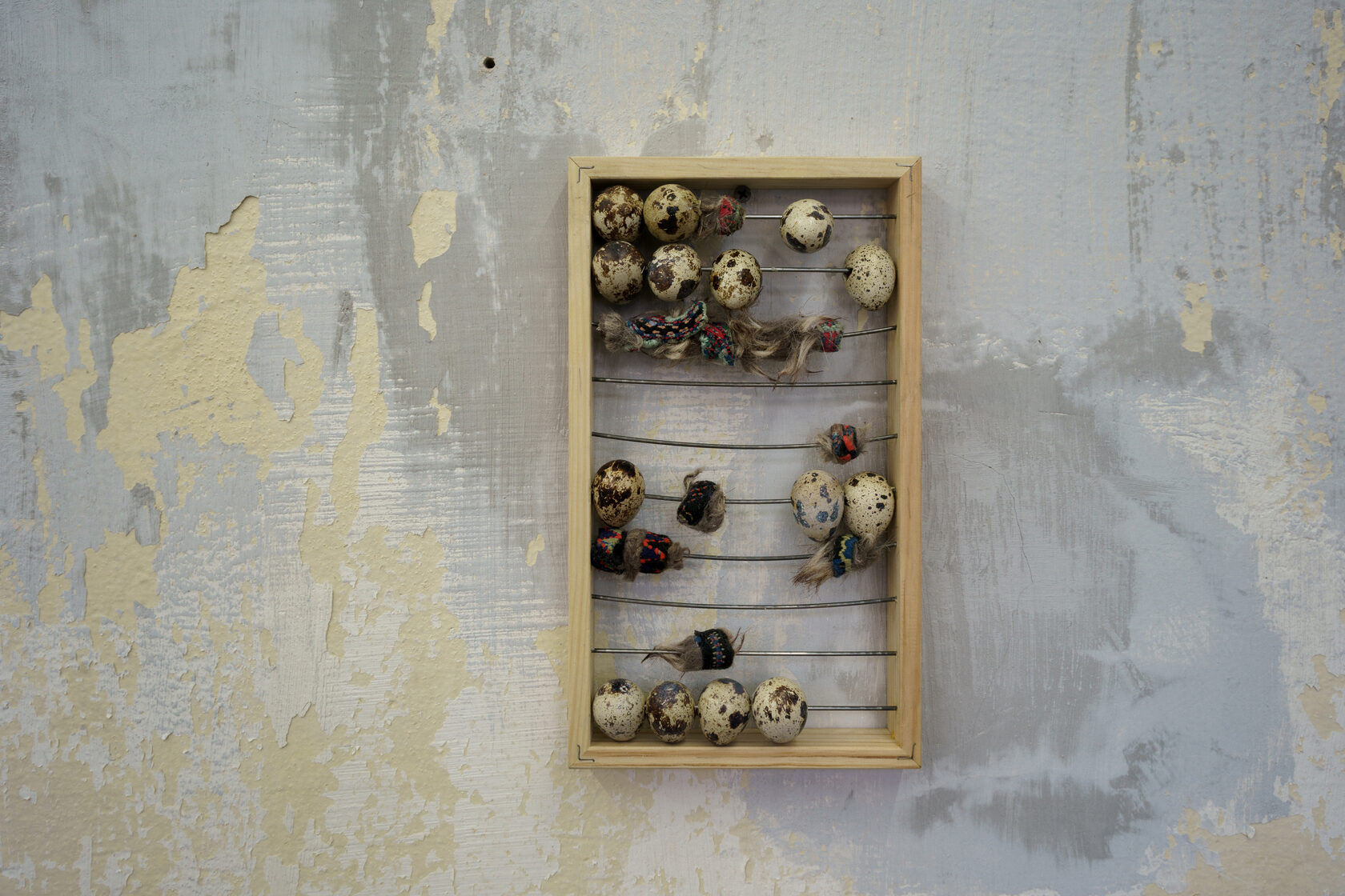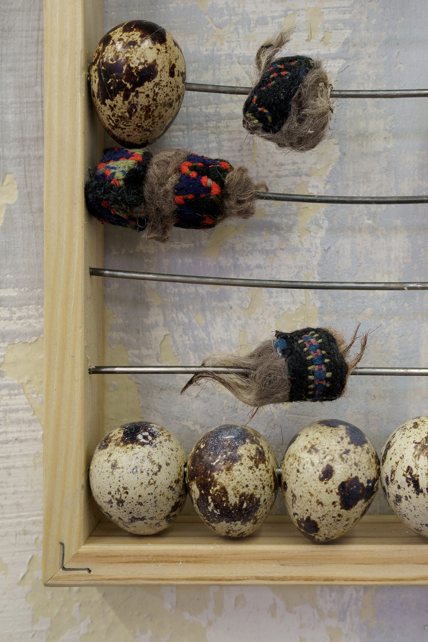 «счёты», wood, wire, quail eggs, fabric, muline, 30 x 15 cm